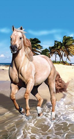 Galloping Stallion Horse Terry Velour Beach/Bath Towel. The towel shown is made of the finest quality, 100% cotton. It is fiber reactive velour and retains it's vivid colors after repeated washings. The actual towel is more vibrant than what you are seeing. Galloping Stallion on the ocean sandy beach towel measures 30" x 60". Machine wash, tumble dry. Perfect for the beach, the pool or bathtime! Need a colorful towel for vacation? Add this magnificient Stallion horse galloping scene towel to your beach gear! Read more...